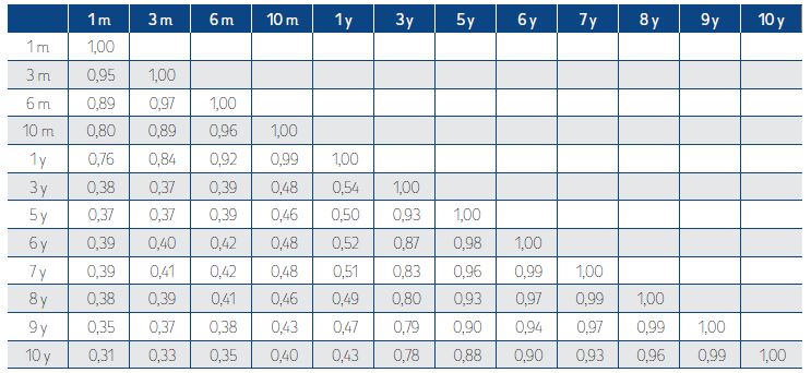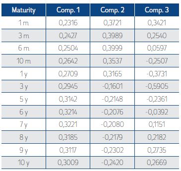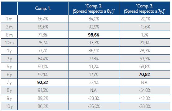La Tabla 3 muestra las correlaciones de la matriz, compuesta por la volatilidad de los diferentes períodos de madurez que representan la ETTI, y sirve como punto de partida para la aplicación de la técnica de componentes principales. En ella se puede observar que la correlación de la volatilidad tiende a disminuir cuando aumenta el spread entre los rendimientos de corto y largo plazo.