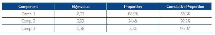 Aplicando la técnica de componentes principales para reducir la dimensión de las doce series de volatilidad condicionada, se obtienen los resultados de la Tabla 4, los cuales sugieren que la variación en el sistema para la volatilidad de la ETTI puede ser explicada, en un 96%, por los primeros tres componentes principales. El primer componente principal (Comp. 1) es capaz de explicar más de un 68% de la volatilidad, mientras que, adicionalmente, el segundo (Comp. 2) y el tercer (Comp. 3) componente principal explican, respectivamente, un 24% y un 3% de la volatilidad de la ETTI.
