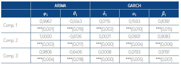 Utilizando lametodología aplicada por Ferrer etal. (2008), Alexandery Chibumba (1997), y Alexander (2000; 2001a; 2001b), se estima la volatilidad para cada uno de los componentes principales, a través de un GARCH (1,1), cuyos resultados se encuentran ilustrados en la Tabla 6.