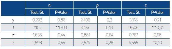 Antes de la estimación del sistema, se aplicaron las diferentes pruebas de raíz unitaria sobre cada una de las variables y se encontró que no todas las series comparten el mismo grado de integración. Los componentes principales que representan la volatilidad de la ETTI son de orden I(0), mientras que las variables macroeconómicas son de orden I(1), razón por la cual no es procedente la aplicación del modelo alternativo de vector de corrección de errores (VEC), dada la inexistencia de cointegración en el largo plazo. Para establecer el número de rezagos en el SVAR se usaron los criterios de información de LR, FPE, AIC, SC y HQ, los cuales sugieren la selección de dos rezagos (FPE, AIC, HQ).6