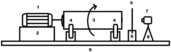 Para lograr el movimiento rotatorio se utiliza un sistema de 4 ruedas y se acopla a un reductor de velocidad instalado a un motor eléctrico de corriente directa que permite el estudio de varias velocidades de rotación. Los estudios se realizan con un 20 % de llenado. Para ello, se determina el volumen real del prototipo partiendo del volumen sin los deflectores menos el volumen de los deflectores y los tornillos de fijación y se determina el volumen real de sólido a adicionar. Estas determinaciones se realizan considerando diferentes flujos de alimentación del sólido. Posteriormente, se llena el reactor prototipo con el sólido finamente dividido para las diferentes velocidades de alimentación de sólidos determinadas.