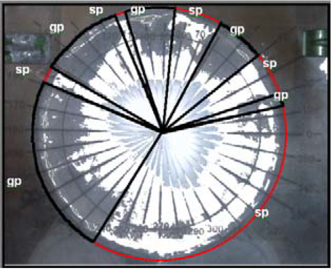 (3)Para cada una de las combinaciones establecidas se toman fotografías digitales a las que se les realiza un tratamiento de la imagen para visualizar las zonas correspondientes al sólido y medir las superficies de contacto sólido-pared y gas-pared. Lafigura 2, muestra un esquema de la instalación experimental mientras que en la figura 3, se observa una foto de la placa de acetato, con la división de las zonas donde la pared está en contacto con el sólido (sp) y con el gas (gp).
