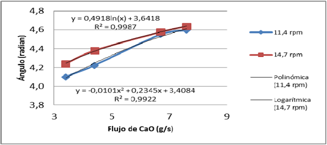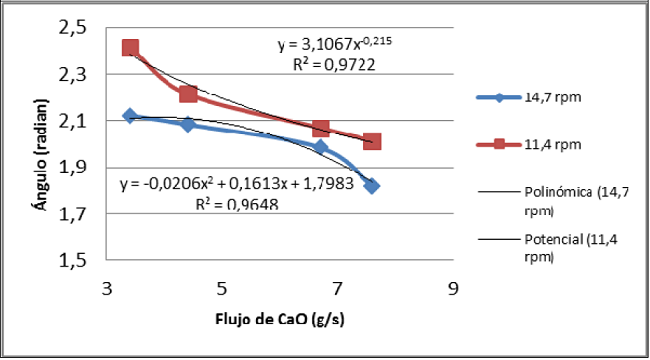 En el caso del contacto sólido - pared, se aprecia que, a medida que aumenta el flujo de entrada de sólidos al reactor, el ángulo va aumentando lo cual se debe a que este incremento del flujo de sólidos provoca una mayor acumulación de sólidos dentro del reactor el cual se adhiere a la superficie de las paredes y se acumula encima de los deflectores durante el movimiento de ascenso de estos. Esto provoca, al mismo tiempo, una disminución de los ángulos de contacto gas - pared como se muestra en la figura 5.