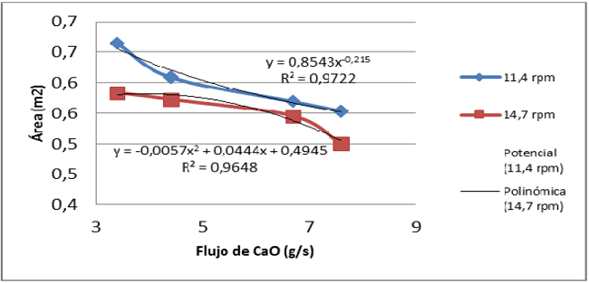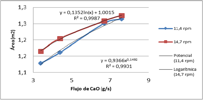 Por otra parte, en la figura 5, se observa que los ángulos de contacto son mayores a medida que aumenta la velocidad de rotación. Esto se debe a que, a medida que la velocidad de rotación del reactor aumenta, la fuerza centrífuga sobre las partículas de solidos tiende a aumentar, provocando que las mismas sean empujadas contra la pared aumentando la adherencia de estas. En las figuras 6 y 7, se muestran los resultados del cálculo de las áreas de transferencia de calor. En estos resultados se puede observar como las áreas obtenidas para el contacto gas-pared disminuyen con el aumento del flujo de sólidos mientras que disminuye el caso del contacto sólido - pared. Este resultado es directamente proporcional al obtenido para el caso de los ángulos de contacto.