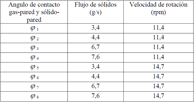 Posteriormente, se ajusta el ángulo de inclinación que se desee estudiar con el sistema de rodamientos (en el caso de estudio es 5º) y se ajusta el motor para lograr las diferentes velocidades de rotación. En la parte anterior del reactor, se coloca una placa de acetato con la medida de los ángulos, en el rango de 0-360º, marcados de manera que facilite la medición de los ángulos que describen el contacto sólido-pared o gas-pared, siendo este ángulo la variable dependiente en función de la velocidad de rotación y el flujo de sólido, que resultan ser las variables independientes. De las mediciones de los ángulos se realizan tres réplicas. La tabla 1, muestra el diseño experimental.