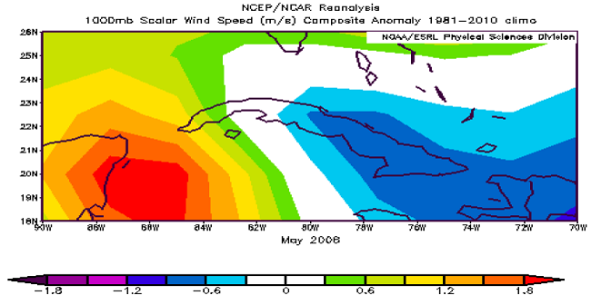 El mes de mayo del 2008, sin embargo, fue un mes con anomalías negativas para la región de estudio (figura 1). Es decir para Gibara I, era de esperarse una baja generación eléctrica producto del viento.