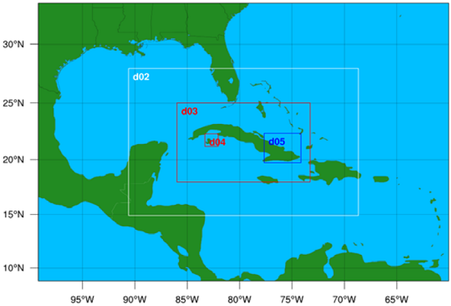 Experimento: Se definen 4 dominios anidados bidireccionalmente, que abarcan a Cuba entera, con resoluciones 27, 9, 3 y 1 km para la zona del parque eólico. En el caso del dominio de 1km, este se centró en el parque y el tamaño se amplió para minimizar el efecto de las montañas