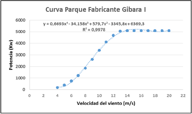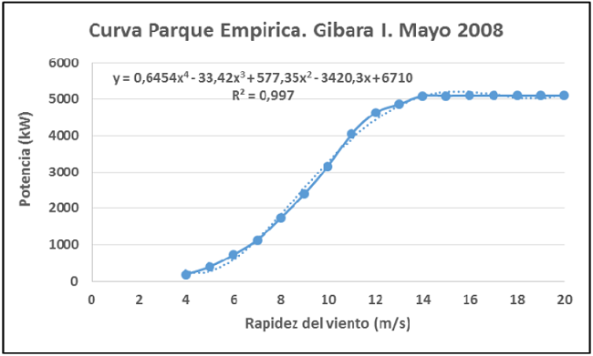 Para el caso del parque eólico de Gibara I, la curva de potencia dada por el fabricante de la firma Gamesa y la curva de potencia actual, también son muy similares en cuanto al ajuste, como se muestra en las figuras 3 a y b, con ligeras diferencias.