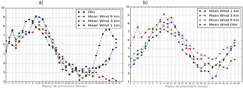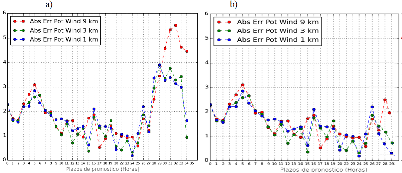 En la misma se aprecia que en el caso del método UPP, los errores se concentran para los tres dominios generalmente por debajo de los 2 m/s hasta las 24 horas de pronósticos, incrementándose a partir de este plazo hasta superar los 5m/s para el dominio de 9km, mientras que para los dominios de 3 y 1km, estos se concentran entre los 2 y 4 m/s. Por este método también se observa que no existe un claro dominio para representar mejor la rapidez del viento en las primeras 24 horas de pronóstico. Si bien en la primeras 12-14 horas, el dominio de 9km da EMA más pequeños, después de esos plazos y hasta las 24 son los dominios de 3 y 1km quienes dan menores EMA, pero en ambos casos sin una diferencia significativa. Sin embargo, cuando se empleó el método de Ley de Potencia del Viento, se obtuvo una mejor correspondencia entre los valores pronosticados y los valores observados para todos los dominios, siendo el dominio de 1km el de mejores resultados. Esto también puede apreciarse en la figura 5 b cuando se analiza el error medio absoluto.
