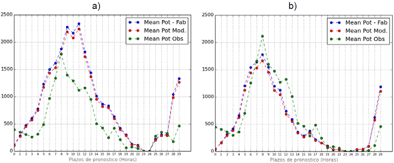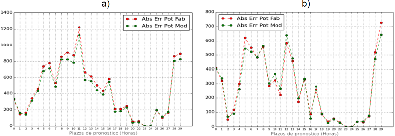 De la figura 6 a, puede apreciarse que ambas curvas de potencia (fabricante y empírica (denotada como Mod), sobrestiman la potencia para todos los plazos de pronóstico, aunque la curva empírica ofrece levemente mejores resultados. Esto se aprecia al analizar la figura 7 b, en que el error absoluto medio es menor.