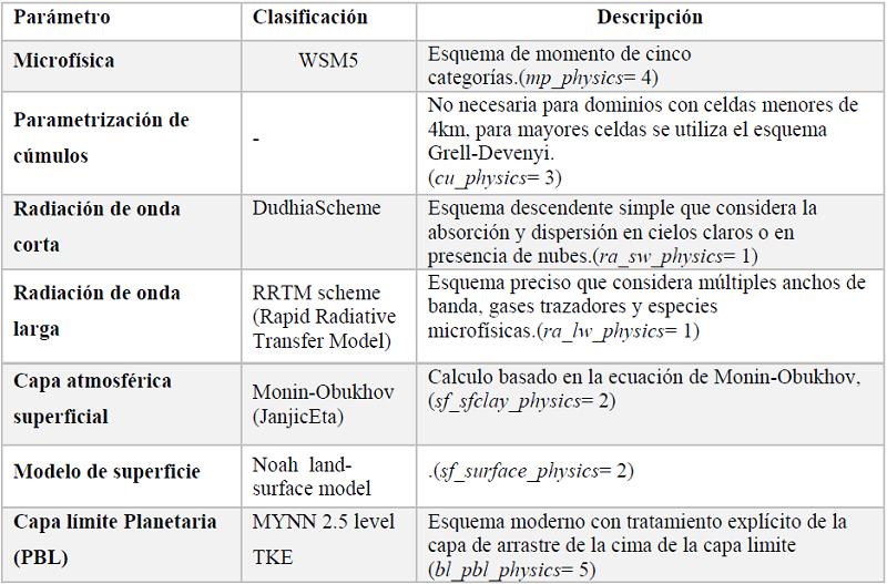La configuración del modelo, incluyendo las parametrizaciones se muestra en la tabla 1, las que han sido estudiadas en trabajos anteriores [7] y [8] para Cuba.
