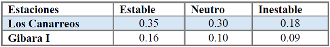 El valor de rapidez de viento a este nivel se obtiene aplicando la ley de potencia del viento [9], tomando como referencia el valor de 10m y los valores de alfa (tabla 2), para distintas categorías de estabilidad (estable, neutro e inestable) para cada sitio de emplazamiento [10], a partir de la metodología propuesta por Emeis (2013) [9], basado en el comportamiento de la temperatura potencial virtual en la capa superficial atmosférica: