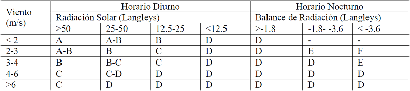 El método utilizado de clasificación en categorías de estabilidad es una variante de la clasificación de Pasquill-Glifford de 1961[12], definido originalmente de la siguiente manera: