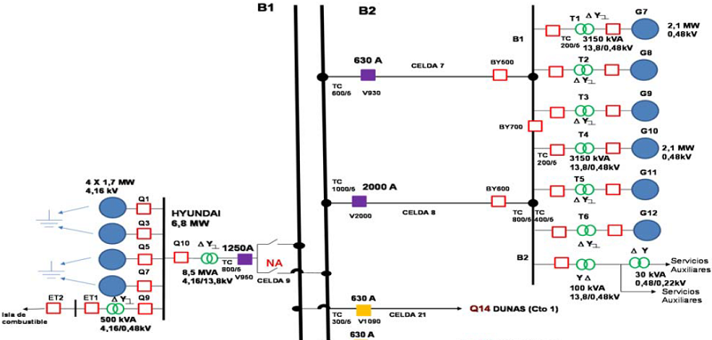 Dos baterías de doce generadores MTU (chinas) alimentados con diésel, cada máquina tiene una capacidad de 2,70 MVA (2,1MW) a 0,48 kV y están unidos a una barra de 13,8 kV por medio de un transformador de 2,5 MVA cada una, para un total de 25,2 MW