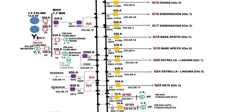 Se ajustó y coordinó también en el enlace un tiempo constante hacia detrás, mirando hacia los generadores, con el tiempo definido del más lento del grupo de máquinas ajustado hacia atrás que en este caso resultó el grupo de las MTU alemanas para fases y para la tierra fue con el de las MAN.
