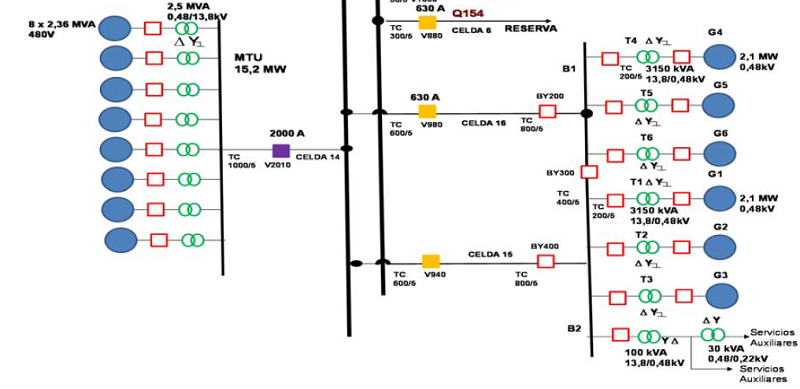El ajuste del umbral de tiempo definido mirando para los generadores se coordinó con los totalizadores de los grupos de máquinas (MAN, HYUNDAI, MTU china) y para el caso de las MTU alemanas con las protecciones de la línea de cada generador. Las cartas de ajuste de los generadores fueron suministradas por la Empresa Eléctrica de Villa Clara aunque los responsables del buen funcionamiento de estas protecciones son de otra empresa, GEYSEL.