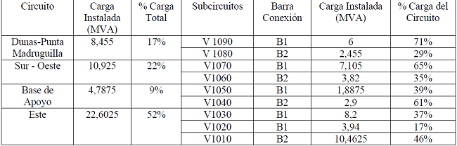 Actualmente la red eléctrica del SEACSM está configurada tal y como se muestra en la tabla 1. Sobresale el tamaño del circuito Este y el desbalance existente. Aunque aparentemente el circuito Sur-Oeste es el que más porciento de desbalance presenta, la diferencia entre el V1060 y V1070 es de tan solo 5.175 MVA, sin embargo en el circuito Este la diferencia entre V1010 y V1030 es de 15.655 MVA, aunque su porciento es menor.