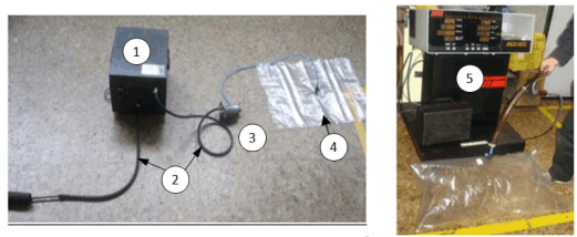 La recolección de los gases se hace desde el ducto de escape, en donde se introduce el tubo de cobre que está sujeto a una manguera de alta temperatura que es punto de entrada a la bomba de vacío. A la salida de la bomba hay una manguera de alta temperatura, que conecta con la trampa de humedad compuesta por gel de sílice depositada en un recipiente. La salida es graduable para controlar el flujo que entra a la bolsa a través de una manguera de uso neumático. Una vez la bolsa está llena, se conecta el analizador de gases para realizar la toma de las medidas. El tiempo de estabilización del analizador es de aproximadamente 2 minutos para la toma de la medida inicial, después de alrededor de 7 minutos se procede a la segunda toma de medidas que es aproximadamente la mitad del contenido de gas que había inicialmente en la bolsa. La diferencia entre la toma de las medidas debe ser mínima, ya que un cambio grande podría indicar que hay filtraciones de aire en la sonda. Para evitar esto, la sonda del equipo SUN es recubierta con una manguera que ayuda a que el equipo sólo succione el contenido de la bolsa. A la izquierda de la figura 1, se puede observar la disposición de los elementos para la toma de estas medidas.