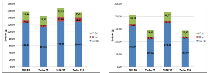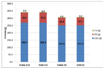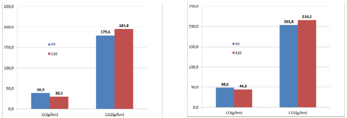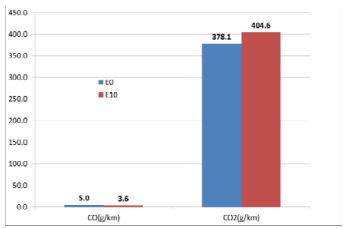 El combustible E10 produce una reducción importante en las emisiones de CO en gramos por kilómetro recorrido, y produce un ligero aumento en las emisiones de CO2 en gramos por kilómetro recorrido, en comparación con combustible E0.