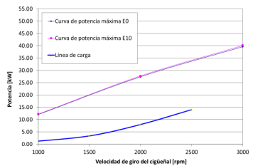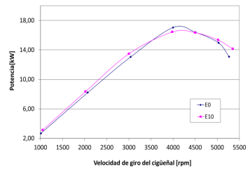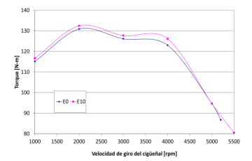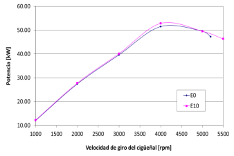 Las pruebas de potencia bajo NTC 1930 para el motor 1 mostraron que, en este equipo con sistema de alimentación por inyección de combustible, la potencia máxima se incrementa 2.9% cuando se emplea combustible E10. Los valores de torque máximo y el consumo específico de combustible, a potencia máxima, aumentan para E10 1.2% y 3.3% respectivamente. Las curvas de potencia, torque y consumo específico de combustible obtenidas en todo el rango de operación del motor muestran en la figura 2, 3 y 4 respectivamente.