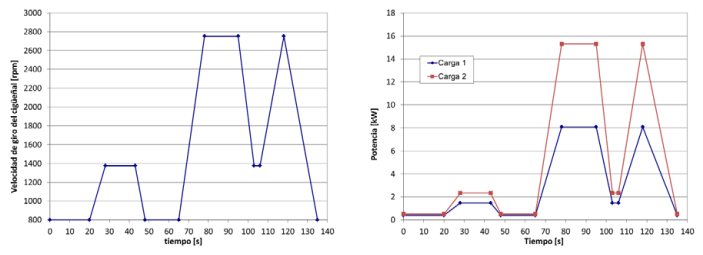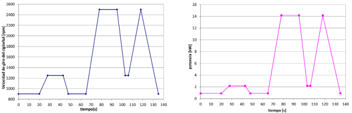 Teniendo en cuenta las características técnicas de este motor, se convirtió el ciclo 10-Mode de velocidad - tiempo a un ciclo rpm - tiempo (figura 6 iz.), aplicando una carga de 14 kW a 2500 rpm en el freno hidráulico (Heenan-Froude referencia B47-912, capacidad 112 kW). Se obtiene una trayectoria de carga bajo la línea de potencia máxima mostrada en la figura 5 y el ciclo de potencia tiempo mostrado en la figura 6.