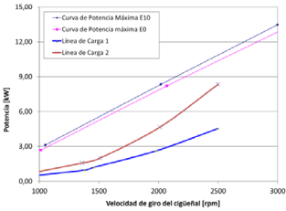 Teniendo en cuenta las características técnicas de este motor, se convirtió el ciclo 10-Mode de velocidad-tiempo a velocidad de giro del cigüeñal. Para este caso se aplicaron dos cargas diferentes en el freno hidráulico, la primera, aplicando 4,5 kW a 2500 rpm y, la segunda, aplicando 8,3 kW a 2500 rpm. En la figura 14, se muestran los ciclos de potencia obtenidos, con respecto al ciclo calculado. Adicionalmente, las trayectorias de carga con respecto a la línea de potencia máxima se ilustran en la figura 15. El ciclo de baja carga se realizó mediante la aplicación de 2 vueltas en el volante de carga del freno, y el ciclo de mayor carga, graduando en 4 vueltas la posición del volante de carga, con el fin de compensar la incapacidad de este equipo de producir una carga significativa a bajas revoluciones.