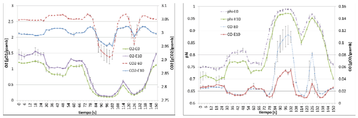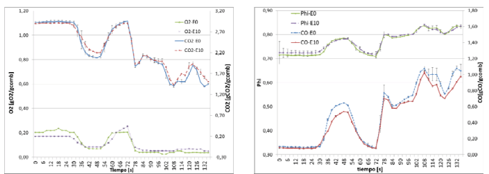 Las pruebas de emisiones muestran que durante el ciclo transitorio de baja carga se logra una mayor reducción de CO empleando gasolina E10 en comparación con la gasolina E0. Con el ciclo de mayor carga las concentraciones de CO y O2 toman valores similares para ambas clases de gasolina. Las emisiones instantáneas de CO para el ciclo de mayor carga tienen un comportamiento inestable a altas revoluciones en este motor. El consumo de combustible por kilómetro recorrido para el ciclo es superior utilizando gasolina E10 comparado con la gasolina E0, siendo la diferencia más notoria en el ciclo de baja carga (figura 19).