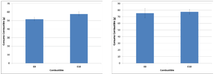 El gasto de combustible entre el E10 y E0 es más notoria para el motor con carburador a baja carga, con un valor del 11% de diferencia, seguido por el sistema de inyección con un 8,07% de diferencia.