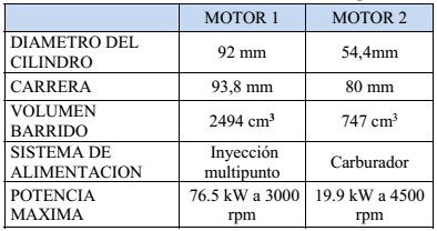 Tradicionalmente este tipo de pruebas se realiza en un banco de rodillos. Sin embargo, para este caso los motores analizados serán montados en el banco de pruebas con freno hidráulico del laboratorio de. Por ésta razón, se debe hacer una conversión del ciclo original, que tiene un perfil velocidad-tiempo, a un perfil velocidad de giro (rpm)-tiempo, el cual se obtuvo haciendo una relación entre la caja de cambios, diferencial y ruedas, con la velocidad que tiene el perfil original. Los motores sobre los que se realizan las pruebas se presentan en la tabla 1.