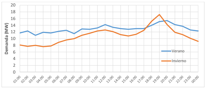 Para los días analizados, la demanda máxima en invierno es de 17,2 MW, 1,8 MW más que para el día de verano, y ocurre a las 19:00 horas, mientras que el pico para el día de verano ocurre a las 20:00 horas. Por el comportamiento de la CCCD se puede concluir que la carga del sistema bajo estudio es predominantemente residencial.