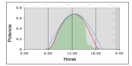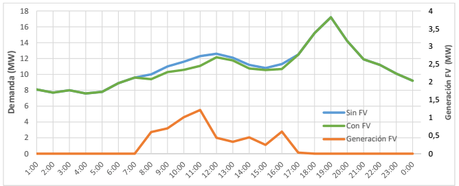 El efecto que tiene en la carga neta la generación de la CFV será más pronunciado en las horas de mayor radiación solar según la estación, lo cual coincide con las horas de máxima generación de los paneles. Esto ocurre en el horario cercano al mediodía como se puede observar en la figura 3.