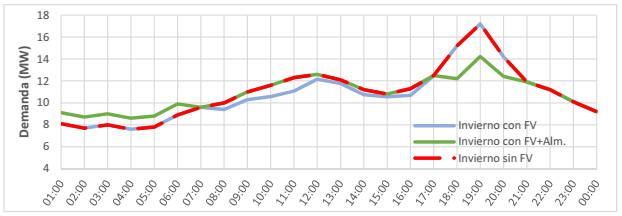 En la figura 5, se muestra el comportamiento de la CCCD para un día típico de invierno, sin CFV, con la misma conectada, y con la propuesta de almacenamiento además de la CFV.
