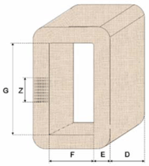 Los parámetros físicos del núcleo enrollado son: (F) ancho de la ventana, (E) espesor de la columna, (G) altura de la ventana, (D) profundidad, es el ancho de la lámina de acero utilizada, (Z) zona de los entrehierros, la longitud de esta zona generalmente constituye una fracción de la altura de la ventana del núcleo, ver figura 1.