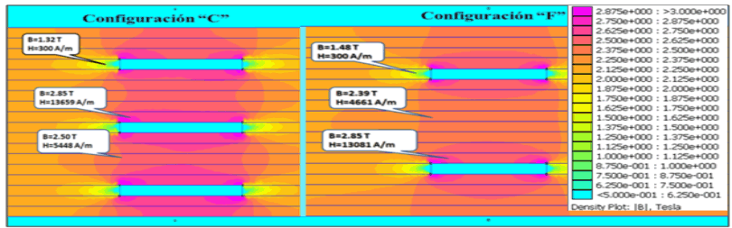 La figura 6, muestra el resultado de la simulación de la zona de los entrehierros de las configuraciones C y F realizada con el objetivo de obtener las densidades de flujo e intensidades de campo magnético.