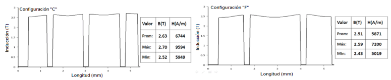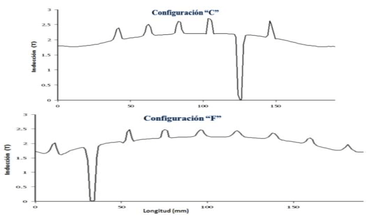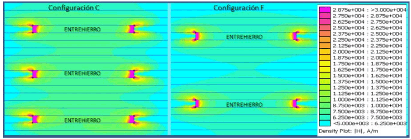 En la zona de la columna de los entrehierros, la configuración C tiene valores de densidad de flujo e intensidad de campo magnético, mayores que la configuración F. Al centro de las columnas de entrehierros, en la dirección transversal, la configuración C tiene valores de densidad de flujo e intensidad de campo magnético, mayores en que en la configuración F.