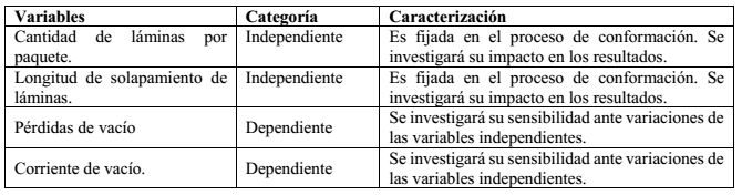 Se definieron un grupo de variables de interés que influyen directamente en el funcionamiento del núcleo de los transformadores, como se muestra en la tabla 1.