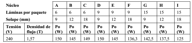 Se fabricó un núcleo con cada una de las diferentes configuraciones de la tabla 2, utilizando un mismo rollo de acero de grano orientado 27Q130, con espesor 0,27 mm y pérdidas específicas promedio de 1,30 W/kg para garantizar iguales características magnéticas y metalográficas. Todos los núcleos tienen las mismas dimensiones físicas de un núcleo de transformador Latino de 50 kVA (altura de la ventana, ancho de la ventana, espesor de la columna, profundidad del núcleo).El proceso de recocido se realizó a todos los especímenes juntos en una misma carga del horno a 800 °C durante 3 horas en ambiente de 100 % de nitrógeno. Las pérdidas y corrientes de vacío fueron medidas en cada núcleo a diferentes valores de densidad de flujo utilizando el sistema de medición automático descrito en [10]. Vea tablas 3 y 4.