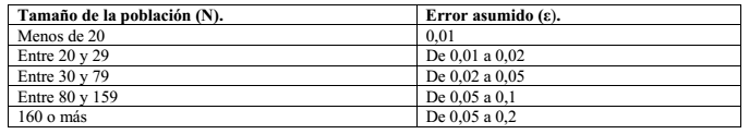 P- probabilidad de que en la muestra estén presentes elementos con las características de la población. (p = 1 - q).Q- probabilidad de que en la muestra estén presentes elementos que no tengan las características de la población, se tomó un valor de 20 %.Z- margen de confiabilidad o número de unidades de desviaciones estándar en la distribución normal que producirá el nivel deseado de confianza (para una confianza del 95%, Z = 1,96).ε- error asumido en el cálculo. Este error se puede asumir hasta un 20 %; en dependencia del tamaño de la población lo cual es mostrado en la tabla 5.