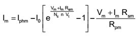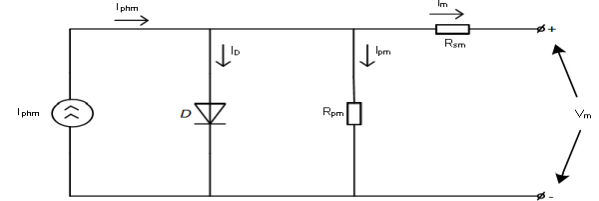 En la figura 1, Iphm es la fotocorriente del módulo en (A), ID es la corriente a través del diodo en (A), Ipm la corriente que circula por la resistencia paralelo del módulo (Rpm ), Im es la corriente del módulo en (A) que circula por la resistencia serie del módulo (Rsm ) y la resistencia equivalente de la carga eléctrica conectada al módulo y Vm representa la tensión de salida del módulo fotovoltaico en (V).