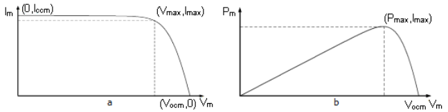 La figura 2.a, muestra la característica externa del módulo fotovoltaico Im=f(Vm), en la que aparecen señalados los puntos antes mencionados, mientras en la figura 2.b, aparece la característica de potencia del módulo fotovoltaico en función de la tensión, Pm=f(Vm).