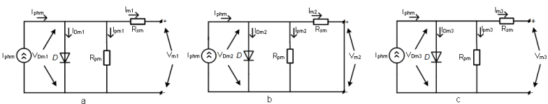 A partir del circuito equivalente del módulo (fig. 1), y tomando en cuenta los datos nominales del fabricante, se plantean los tres circuitos representado en la figura 3, para facilitar la comprensión de los cálculos y los posteriores análisis.