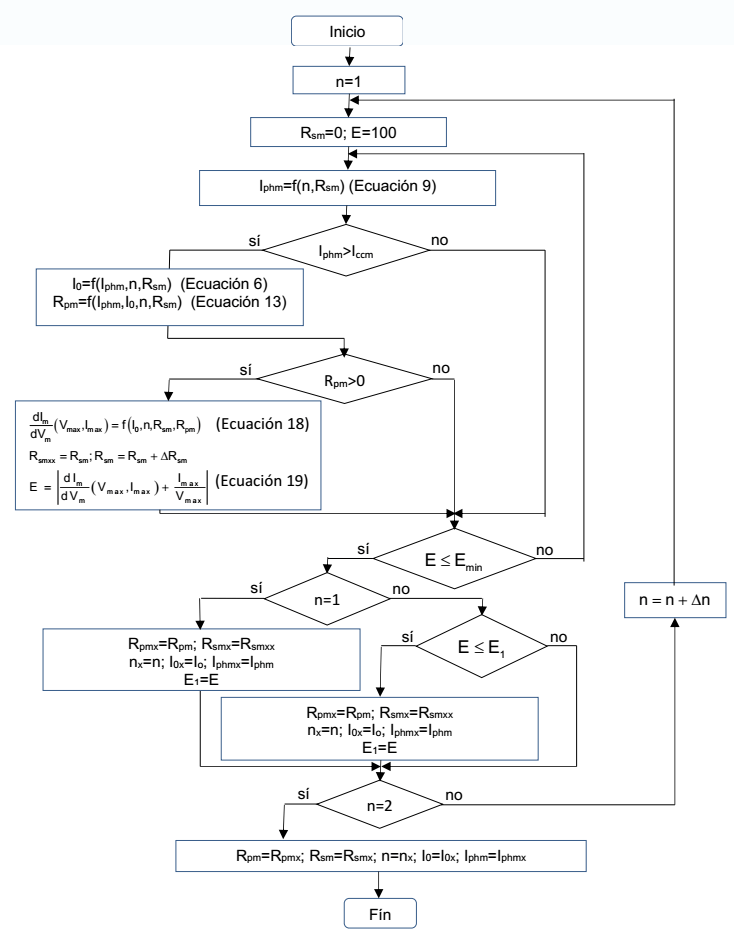 El procedimiento de cálculo se realiza explorando el intervalo en que puede variar n. Para cada valor de n se asume inicialmente el valor de Rsm igual a cero (Rsm=0), y se calculan en el siguiente orden los restantes tres parámetros Iphm , I0 y Rpm . Para cada valor de n se incrementa Rsm en un valor ΔRsm , se va obteniendo el valor de la pendiente y se va calculando el error absoluto, mediante la ecuación (19), hasta lograr que el error sea menor a un error mínimo (Emin), definido por el usuario, cumpliendo esta condición quedan calculado para el valor n, los restantes cuatro parámetros del circuito equivalente.