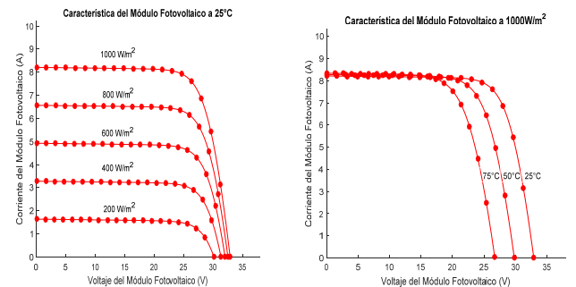 Además, en la figura 5, se muestran, curvas de corriente en función de la tensión Im=f(Vm), obtenidas a diferentes irradiancias y temperaturas con los parámetros calculados mediante la metodología desarrollada, así como se adicionan puntos marcados en la figura mediante círculos, que representan puntos experimentales, extraídos de las curvas de la hoja de datos del fabricante [23]. Como se puede observar, para todos los casos, se obtienen magníficos resultados, los puntos experimentales se encuentran sobre las curvas obtenidas mediante el modelo propuesto.