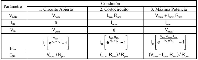 La ecuación (1), resultado del circuito equivalente propuesto en la figura 1, contiene cinco parámetros desconocidos, Iphm , Rsm , Rpm , I0 y n, cuyos valores se determinan a partir de los datos aportados por el fabricante en la hoja de datos de sus módulos fotovoltaicos, que básicamente representan tres puntos de la característica: 1) el punto de cortocircuito (0,Iccm ), 2) el de circuito abierto (Vocm,0) y 3) el de máxima potencia (Vmax,Imax ) .Los datos de estos tres puntos corresponden a las condiciones estándar de 1000W/m2, una temperatura de 25 ᵒC y una masa de aire (AM=1.5).