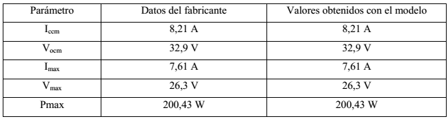 La tabla 2, muestra los datos ofrecidos por el fabricante en su hoja de datos y los obtenidos mediante el modelo propuesto, donde se aprecia que los valores coinciden con los del fabricante.