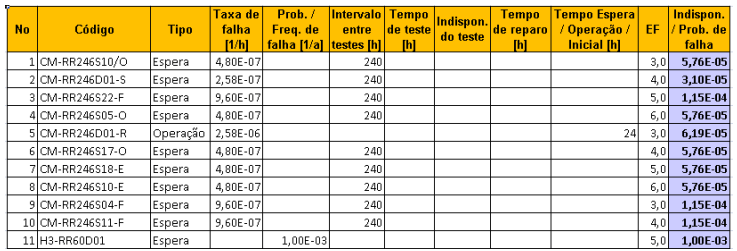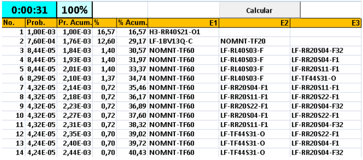 Trata-se de uma árvore com 370 portões lógicos e 675 eventos básicos, mas que gera uma imensa quantidade de CM, superior a 1012, com contribuições bastante uniformes, que reduzem a efetividade do truncado por probabilidade. Neste caso a planilha Excel permitiu avaliar grandes quantidades de CM e determinar os CM mais importantes para a tomada de decisões (figura 5). Os tempos de execução não resultaram excessivos. Os resultados são mostrados na tabela 2.