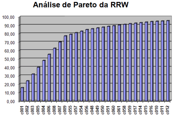A figura 4, mostra a análise da medida de importância Redução de Risco (RRW) na forma de um Diagrama de Pareto. Conclui-se que uma tomada de decisões efetiva sobre os 6 componentes mais importantes identificados pelo estudo, permitiria um aumento da confiabilidade e, consequentemente, uma redução de risco de 50%.