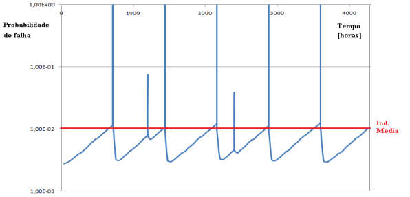 Adicionalmente, a figura 6, mostra uma análise de indisponibilidade instantânea, que permite considerar o impacto da estratégia de testes periódicos dos componentes. Esta avaliação determina um valor mais realista da indisponibilidade média do sistema (1,03E-2), mostrando a necessidade de um escalonamento dos testes de componentes redundantes.