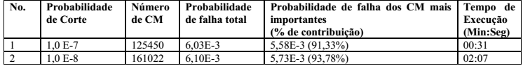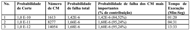 Nas rodadas 2 e 3 o valor da probabilidade de corte é reduzido e os tempos de execução começam a aumentar significativamente, mas os novos CM adicionados são de baixa probabilidade e só aumentam levemente a probabilidade de falha total. Os CM mais importantes permanecem praticamente os mesmos.
