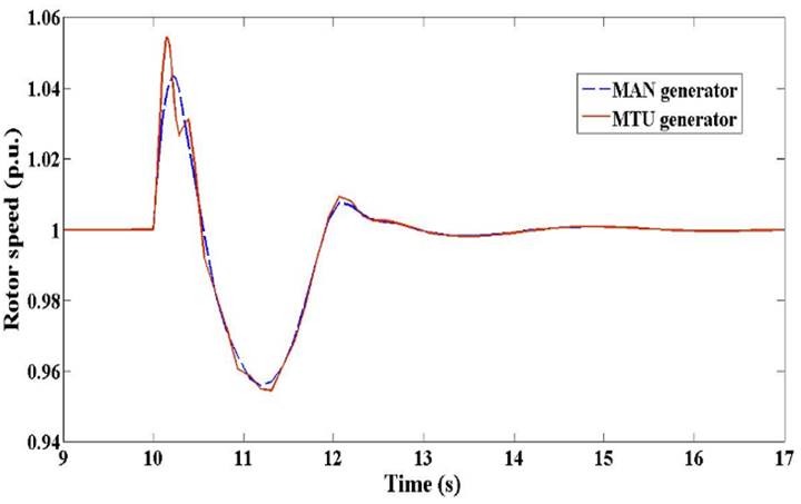 Due to the number of generators and their distribution in the system, it is possible to analyze two local modes and the inter-area mode between area one and area two. A local mode of area one is represented by the MAN generators, according to the participation factors analysis, the major contribution of these generators is in the modes 9 and 10. The area two is represented by MTU generators and the most important mode with less damping ratio is the modes 5 and 6. Finally, the inter-area mode is represented in the modes 14 and 15. The time domain analysis was performed to visualize the rotor oscillations of synchronous generators for base case scenario. For this, a three phase short-circuit fault was applied at bus 8in the second 10 of the simulation and cleared after 70 ms. The rotor speeds of MAN and MTU synchronous generators were observed at figure 2.